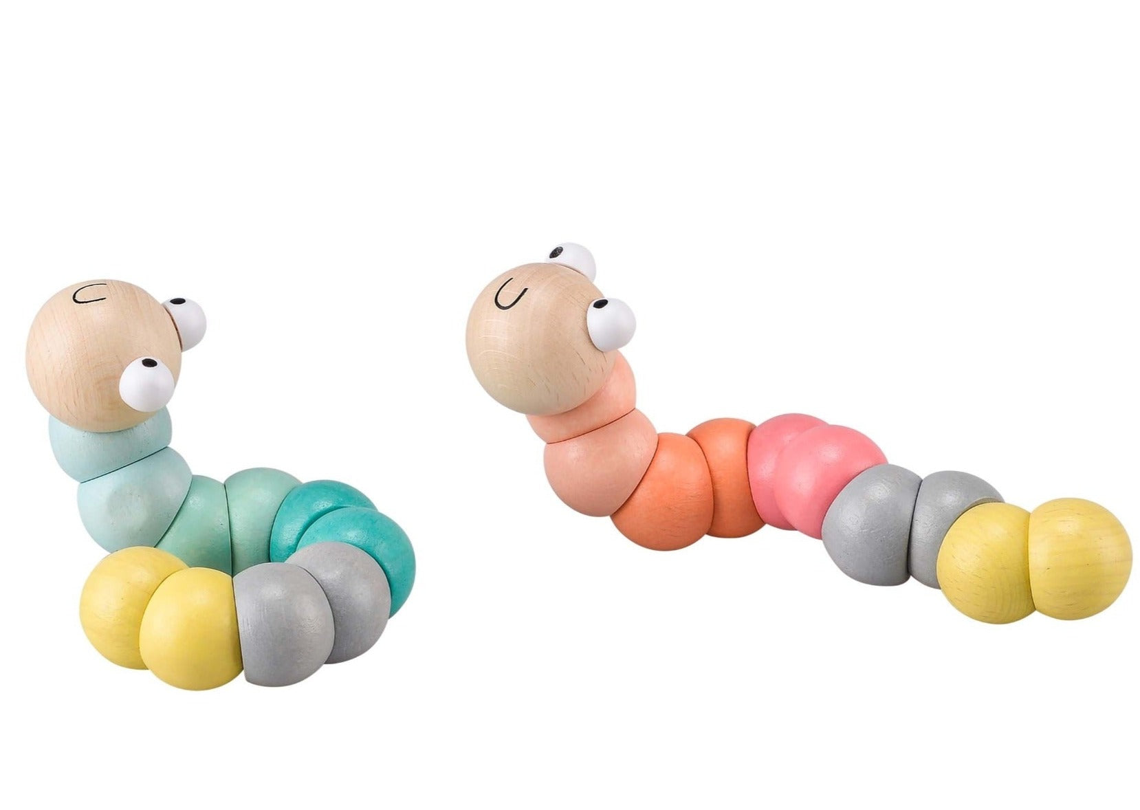 This beautiful wooden toy worm bends, twists and turns into many different shapes and configurations! Your little one will love playing with this happy little worm!