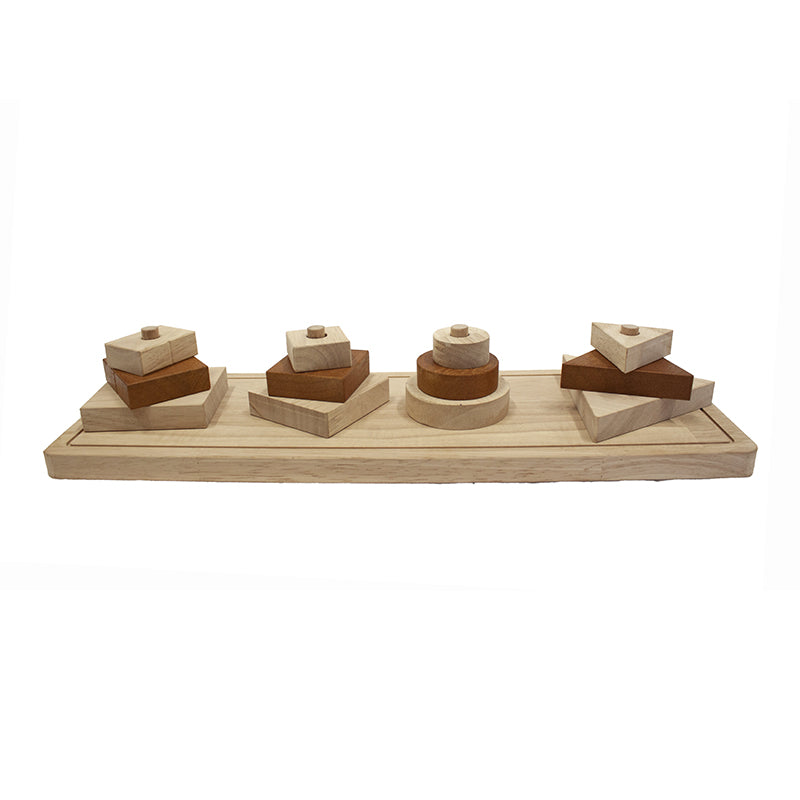 Our 12 piece wooden shape sorter puzzle comes with a wooden base featuring 4 pegs, this offers guidance yet open for play exploration for children. This product offers strong fine motor development and hand-eye coordination