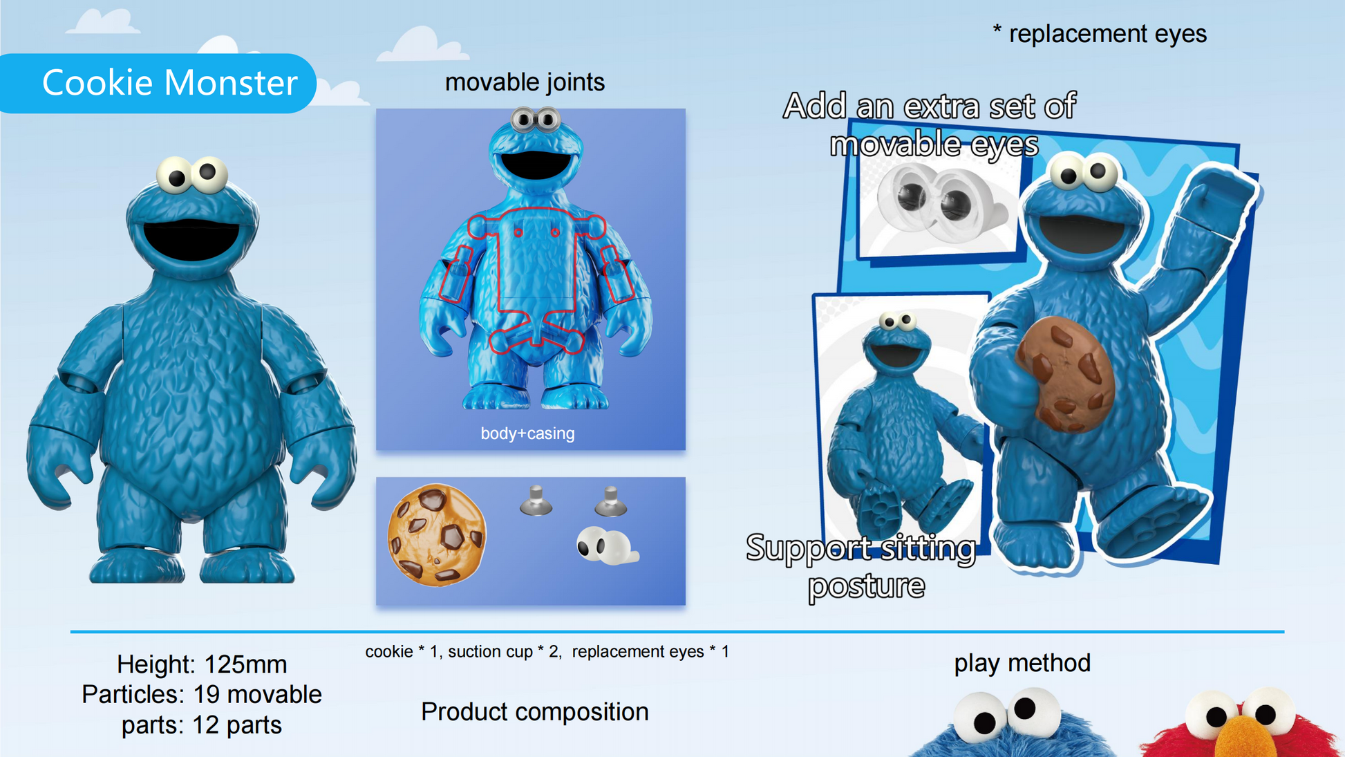 Figure Size: Height: 125 mm Particles: 19 movable Piece Count: 21 pcs Package Size: 70 x 108 x 140 mm Product Composition: cookie * 1, suction cup * 2, replacement eyes * 1