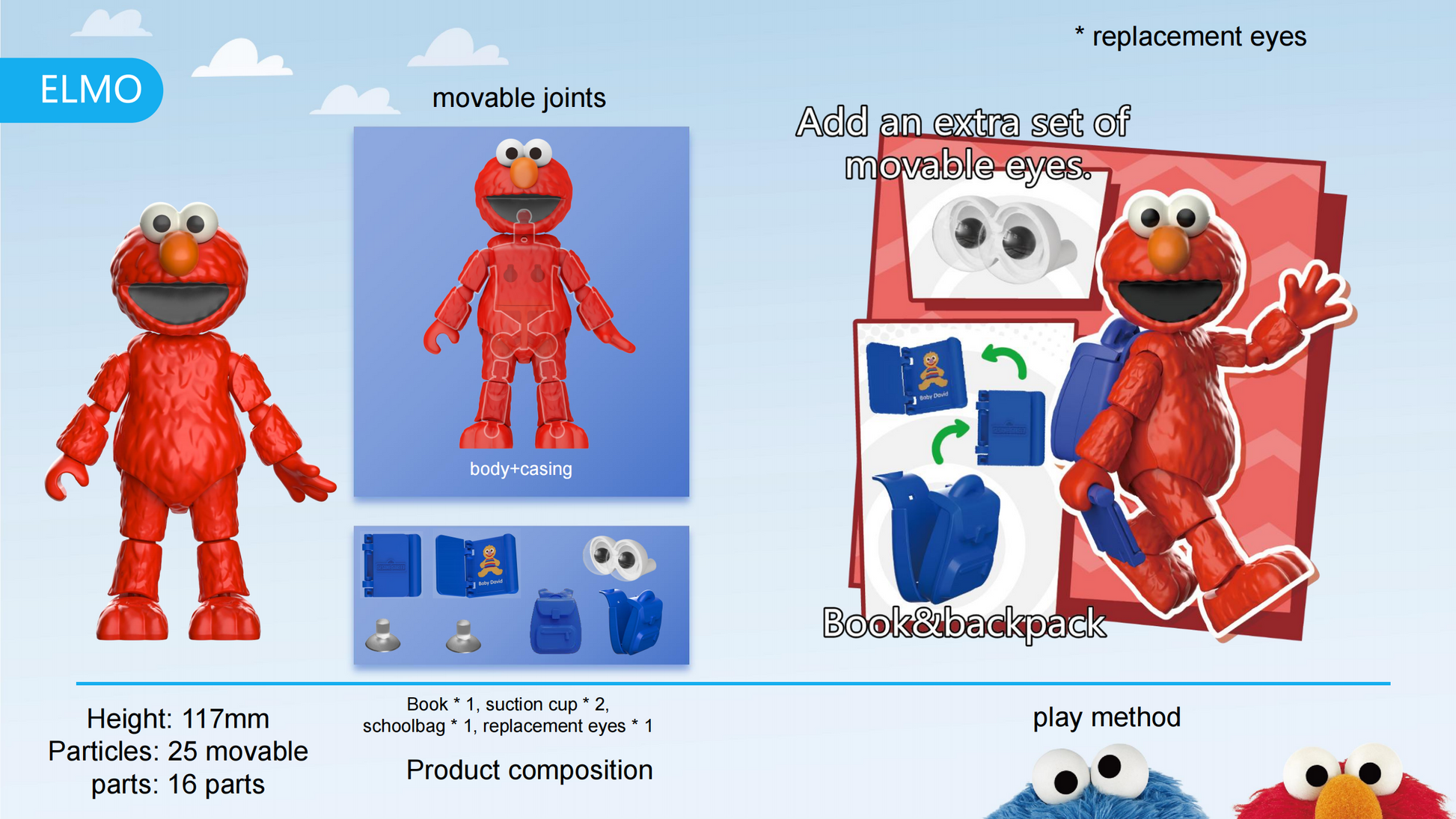 Elmo is a 3½-year-old red monster with a distinctive cheerful voice and a contagious giggle. Enthusiastic, friendly, and curious, he loves to explore new things and be a part of everything that happens on Sesame Street.