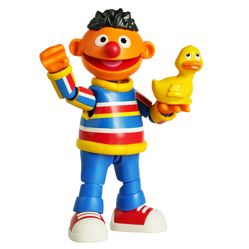Ernie lives in the basement apartment of 123 Sesame Street with his best friend, Bert. Ernie is best known for his practical jokes, his love of baths and his Rubber Duckie.