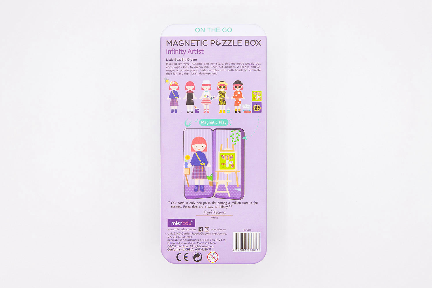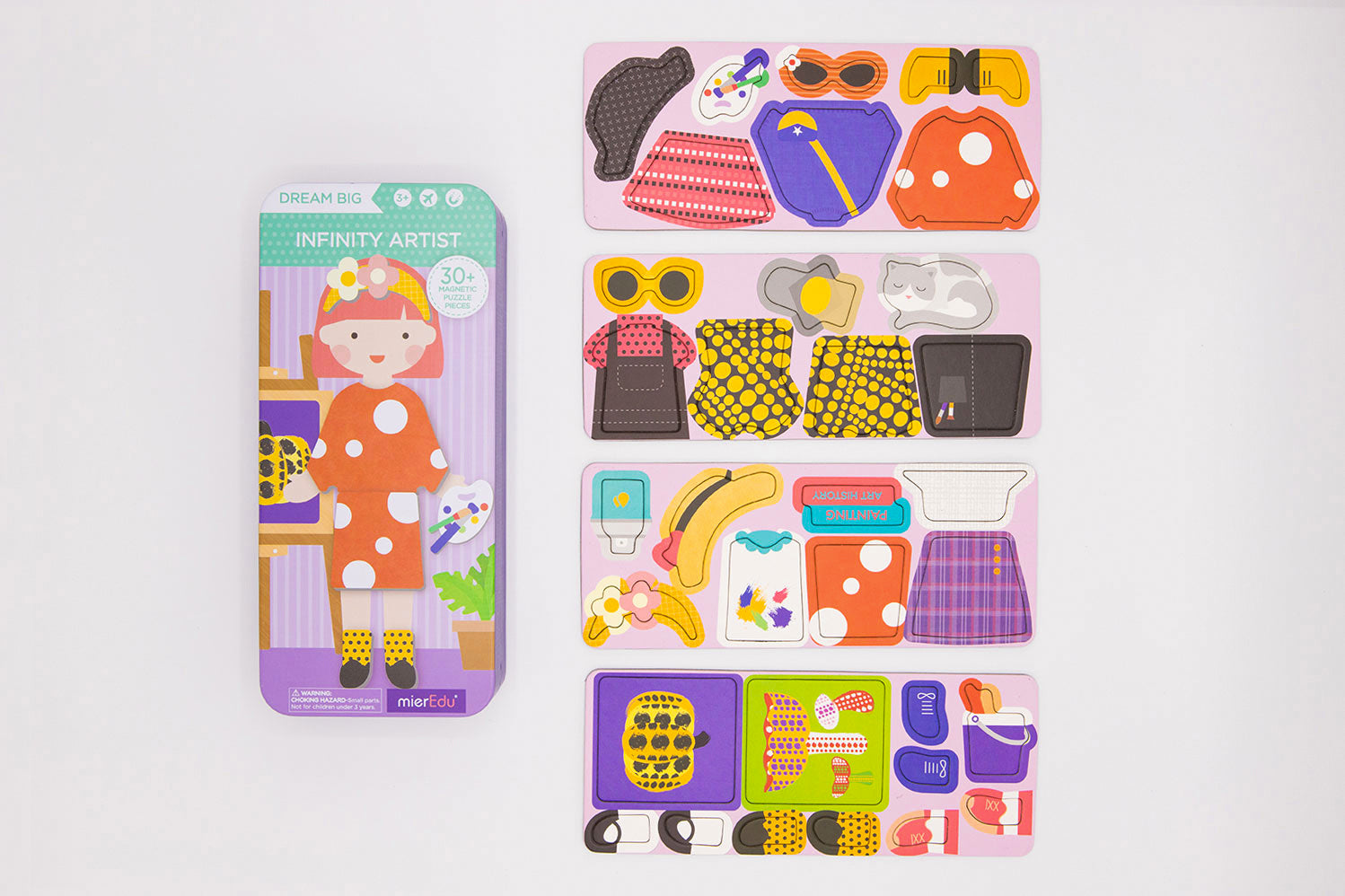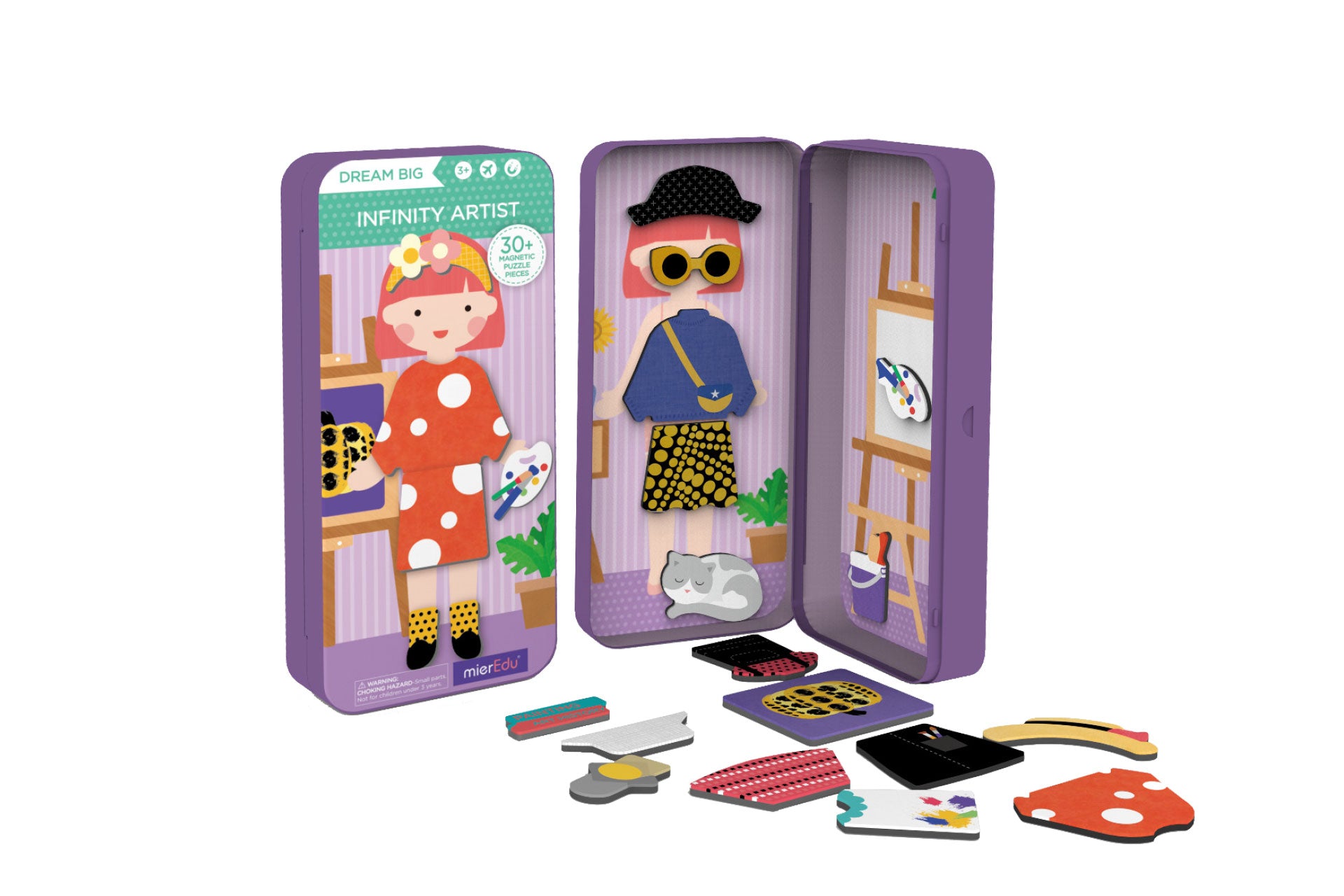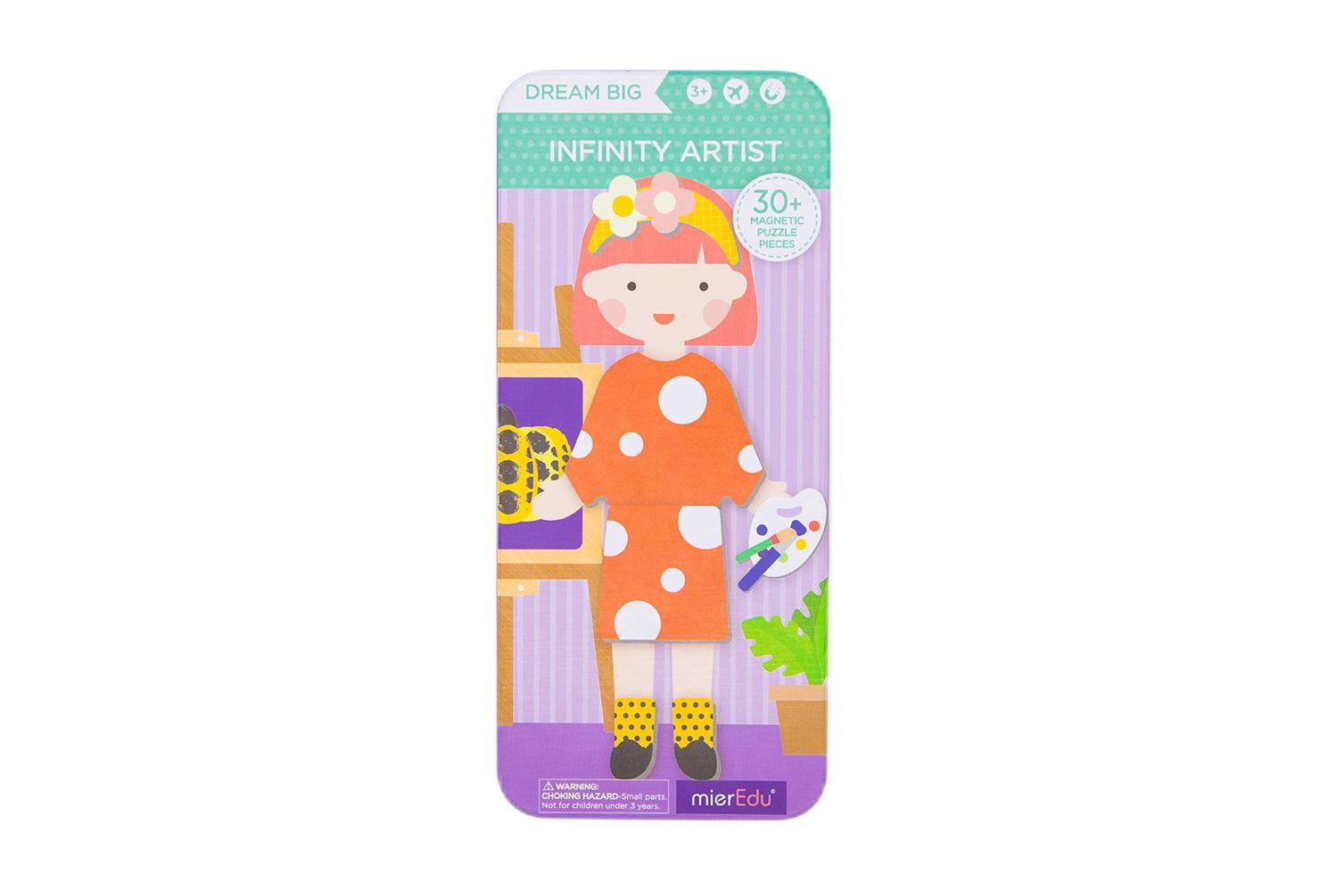 dream big! With the Infinity Artist set, they can follow in their favourite artist's footsteps and create their own masterpieces. Each set includes two scenes and more than 30 magnetic puzzle pieces, where they can dress up their character and invent their own stories. Using touch and feel, kids can play with both hands to stimulate their left and right brain development.