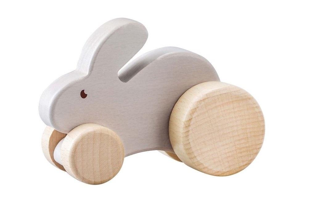 The Wooden Wheelie Bunny is a perfect toy. It's simple design makes it easy to grab and push along, keeping your little one entertained for hours. Made from durable and sustainable rubberwood, this cute wooden bunny toy is painted on both sides.